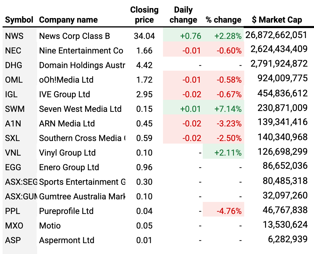 The two major audio players both had down days, with Southern Cross Austereo losing 2.5% to land on a market capitalisation of $140.3m, just ahead of the $139.3m of ARN Media, which lost 3.2%.